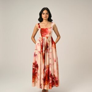 The dress showcases a vibrant all-over floral print in rich shades of pink, red, and maroon, creating a striking yet graceful look. With its flared, flowy silhouette and 50” length, it’s the ideal outfit for parties, casual outings, or festive gatherings.